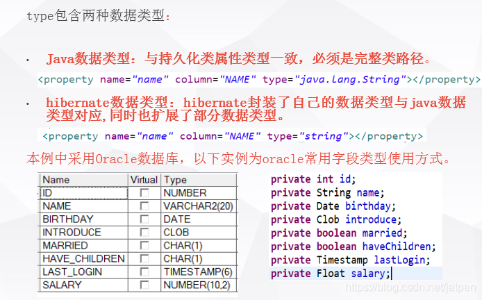 noop(了解):它映射Java持久化类中不存在的属性,即主要用于HQL(用query接口测试,使用hql语句)中,当数据库中有某列,而实体中不存在的情况。