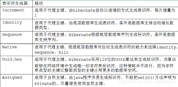 - sequence 生成器:利用底层数据库提供的序列来生成标识符。