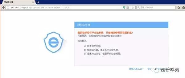 继续使用order by测试数据表列数。发现有5列。在使用and和union select的时候发现果然被安装的安全狗拦截了。
