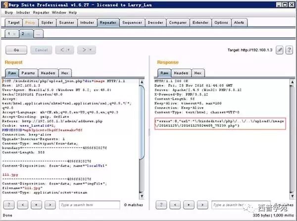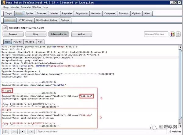 我们通过burp把上传的HTTP包抓下来,然后自己进行一下修改POST数据。经过了一些实验,直接说结果吧,当增加一处文件名和内容,让两个文件名不一致的时候,成功绕过了安全狗的防护,上传了php文件。原因是安全狗进行文件名匹配时候用的是第一个文件名test.jpg,是复合安全要求的,但是webserver在保存文件的时候却保存了第二个文件名test.php,也就是if(security_check(a)){do(b);},导致安全检查没有用,php文件已经成功上传了: