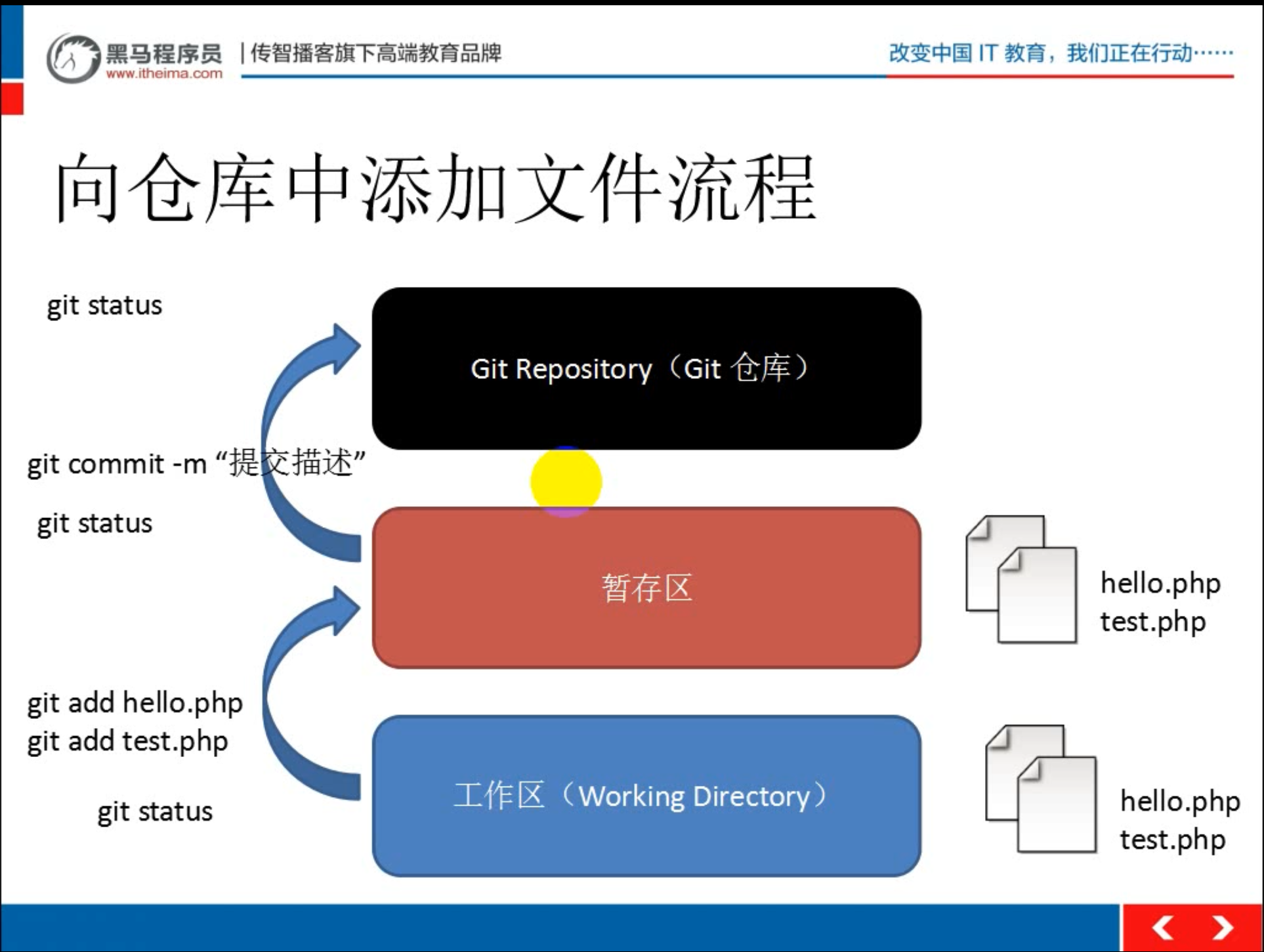 一.Git基本工作流程 Git工作区域 向仓库中添加文件流程 二. Git初始化及仓库创建和操作 基本信息设置 . 设置用户名 git config --global user.name 'itcas ...