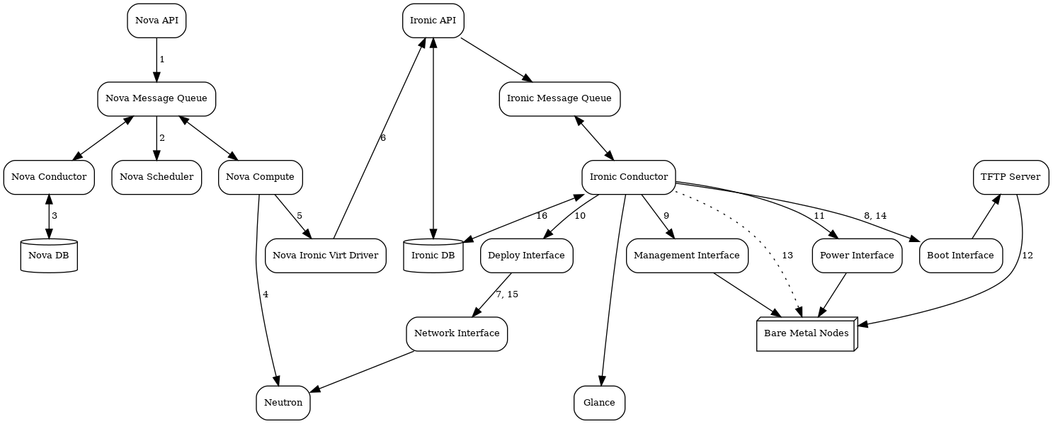 - Nova’s ironic virt driver issues a deploy request via the Ironic API to the Ironic conductor servicing the bare metal node.