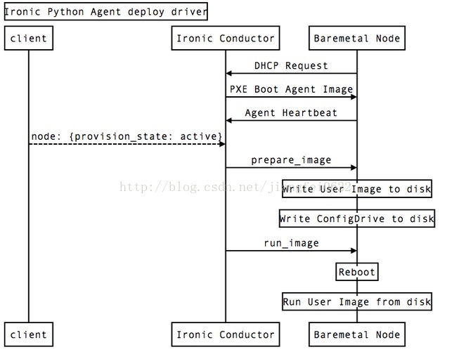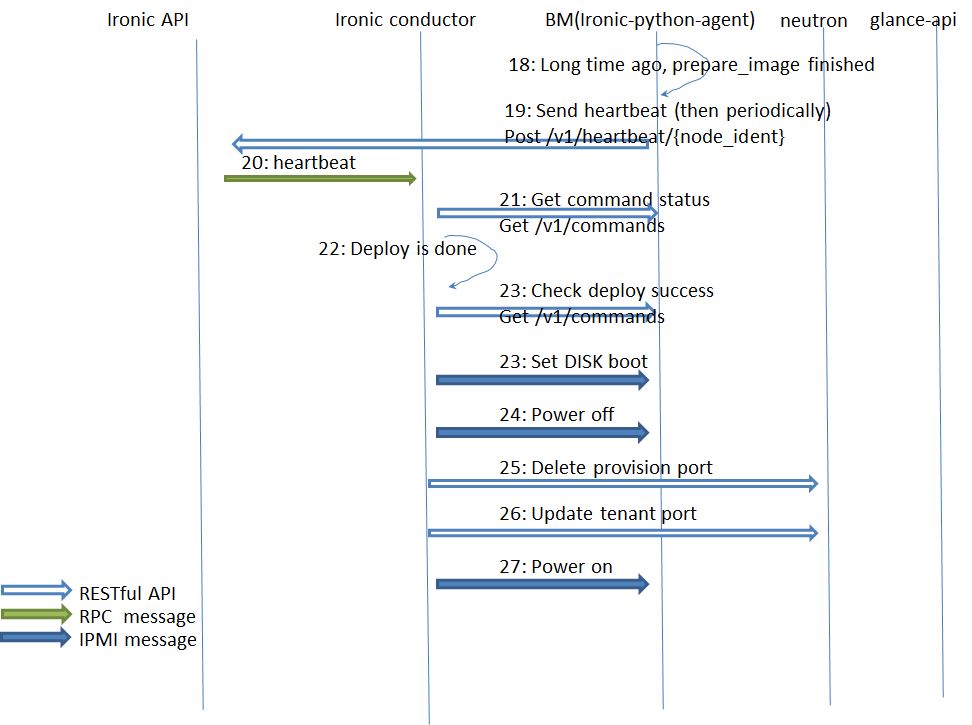 - ironic-conductor 收到 Heartbeat 消息后(从 ironic-api 过来的 RPC 消息),根据当前状态的不同有相应的处理。第一个 Heartbeat 消息会触发 ironic-conductor 下发 prepare_image 到 IPA,以后的 Heartbeat 消息会触发 ironic-conductor 查询 IPA 上的 command status,它的目的是要监控 prepare_image 等 command 是否还在运行中。一旦 command status 显示命令结束。就会继续下一步部署操作,包括设置物理服务器从磁盘启动、关机、切换网络、开机。知道部署流程结束。