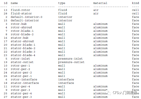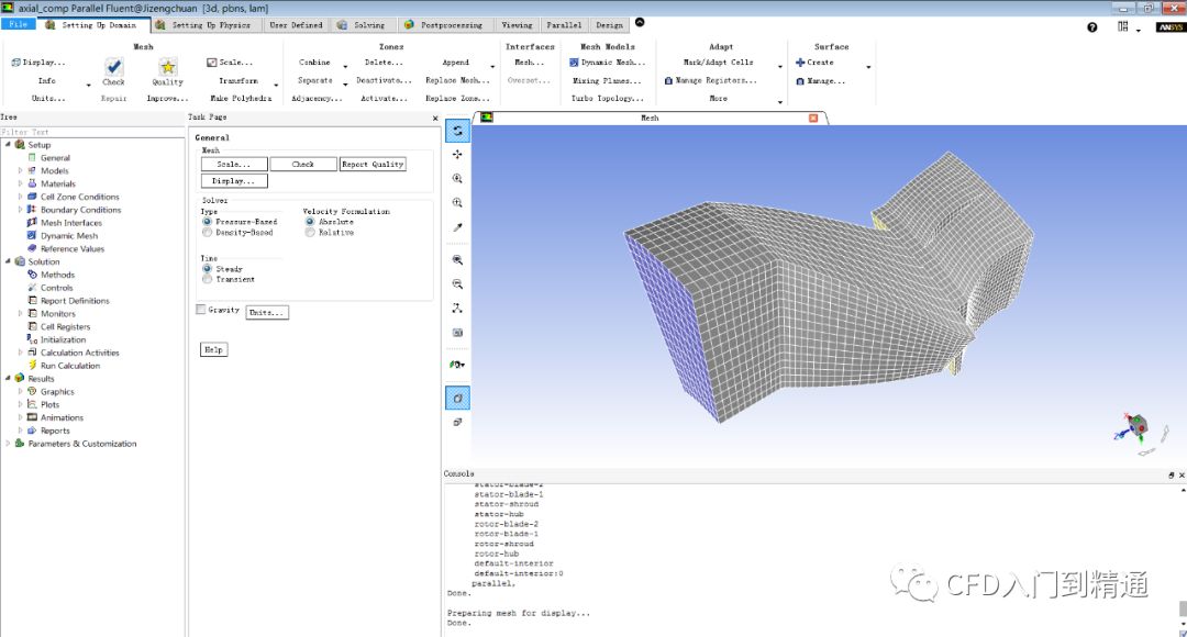 选择菜单栏【Setting Up Domain】>【Mesh】>【Check】,当前提示有两个未分配的交界面。由于此时还未对交界面进行设定,故此warning可忽略。旋转图形界面的网格,查看不同类型边界以不同颜色显示:蓝色为转子进口面,红色为静子出口面,黄色则为静子和转子之间的交界面。