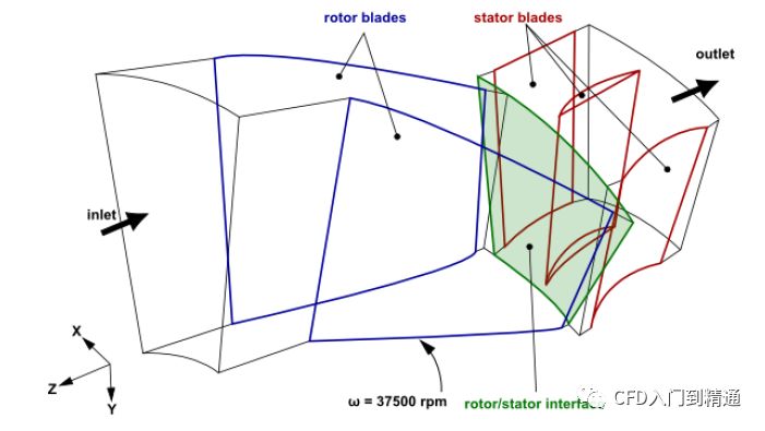 本算例仿真的轴流压缩机系统包含转子和静子两部分,转子置于前端,静子置于后端,这是一个非常典型的单级轴流叶轮系统。通过将转子流域与静子流域放置在一起进行瞬态求解可以获得转-静流域之间的干涉。