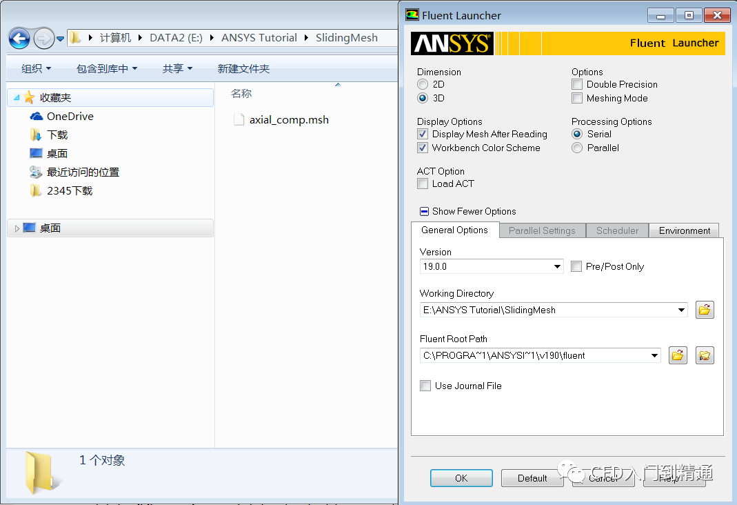在硬盘上创建英文名称的文件夹(例如SlidingMesh),将网格文件axial_comp.msh 拷贝至该目录下。启动Fluent 19.0,在Fluent Launcher中,Dimension选择3D,Display Options中勾选Display Mesh After Reading和Workbench Color Scheme,Processing Options选择Serial,设置使用单核计算(用户可以根据现有的硬件资源和License授权酌情选择合适的并行数),更改Working Directory路径至该网格文件目录下,点击OK启动Fluent 19.0。