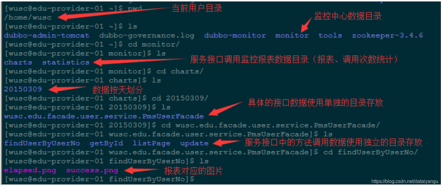 看上面配置文件中标红的的 3 行内容,理解user.home这个变量的意思则可,{user.home}这个变量的意思则可,user.home这个变量的意思则可,{user.home} 指的就是启动 dubbo-monitor 程序的操作系统用户目录。我们这里用的是 wusc 用户,那么 就是/home/wusc 目录(如果是 root 用户启动,那就是/root)。