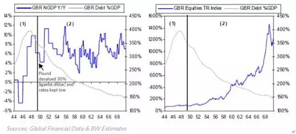 下图左表示不同年份债务水平和名义GDP增长率的关系,下图右表示不同年份债务水平和股票的总回报率的关系。直线表示有大量的货币印刷。第一个阶段标记为(1),第二个阶段标记为(2)。英国在二战前及二战期间产生大量的债务,二战结束后经济进入萧条期,债务负担进一步加重。如图所示,从1943年底至1947年底,债务占GDP比从250%上升至400%。当1948年收入恢复时,债务负担略有减轻,1949年9月英国加大印钞量并且将英镑贬值约30%,同时将短期利率基本维持在零的水平。因此在1948年到1969年间,名义增长率超过名义利率,债务水平下降约250%,股市得以恢复。