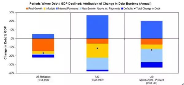 私人部门债务/GDP比减少了约37%。虽然债务违约和通货膨胀也有一定作用,但债务偿付才是最大的影响因素,而非利息支付。