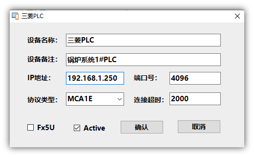 (1)通过PLC设备右击选择三菱PLC,在打开的窗体中设置好IP地址、端口号,这里的协议类型选择MCA1E:
