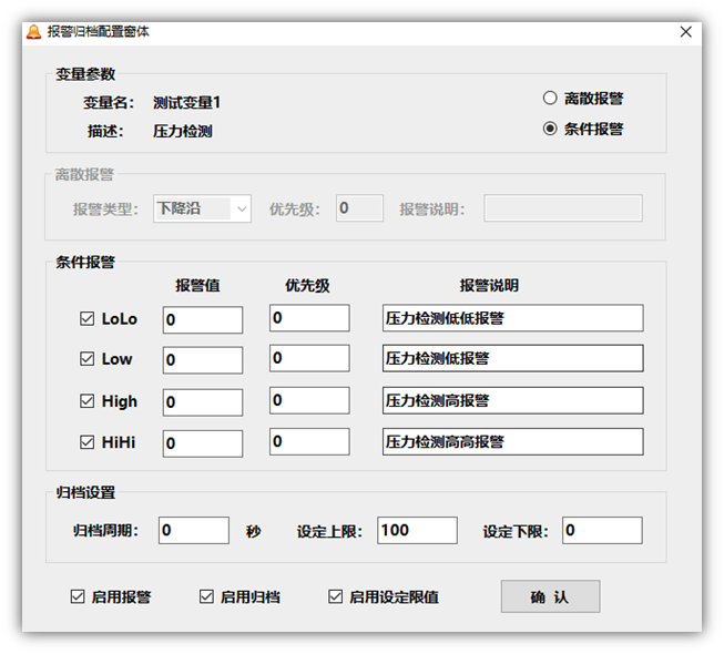 (4)对于变量配置,左下角会有一个报警归档配置,主要用于配置该变量的报警类型、归档方式及设定限制: