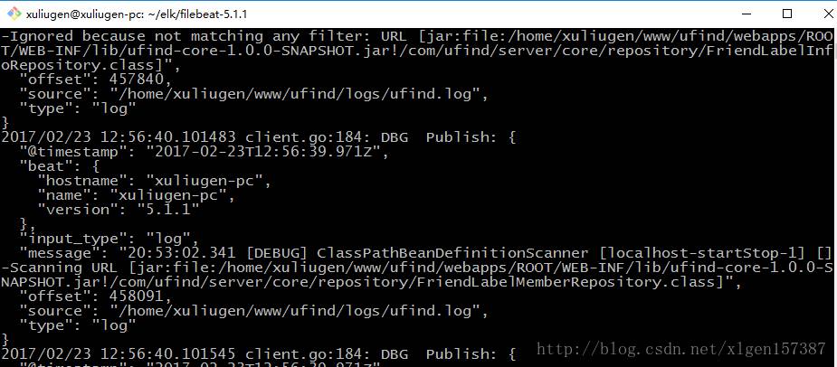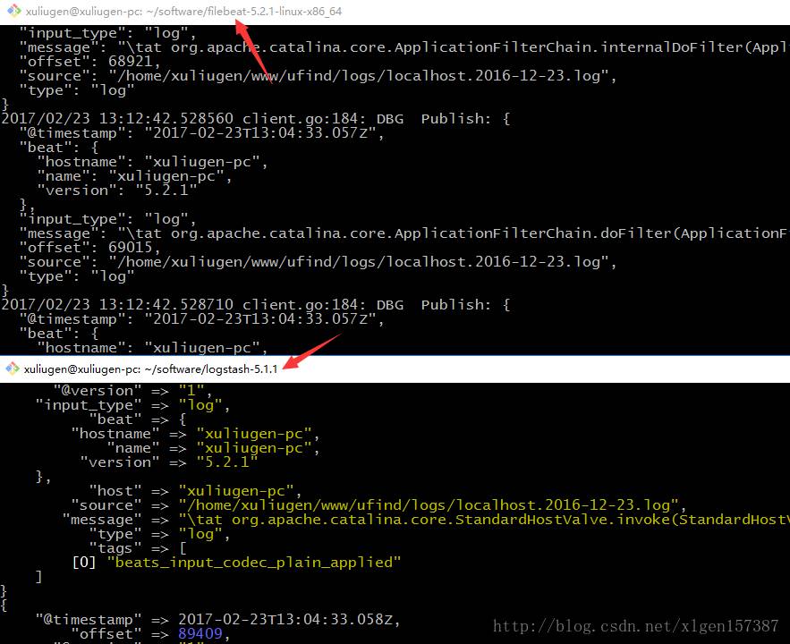 如果配置成功的话,如果你的Tomcat服务器有日志更新,在Logstash和Filebeat都会显示出来:
