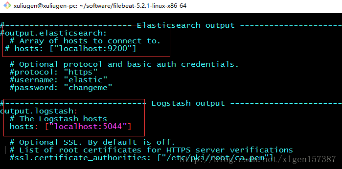 同样是修改filebeat.yml文件,将output.elasticsearch注释掉,并打开Logstash的注释,修改之后内容如下: