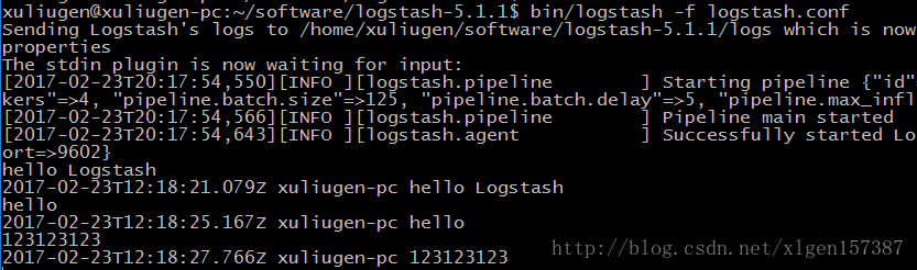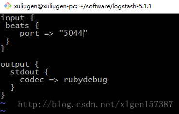 首先创建一个名为logstash.conf的配置文件放置在logstash-5.1.1目录下,内容就是刚才使用命令行方式的代码,如下: