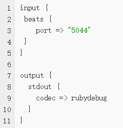 这里将beats(就是Filebeat)插件作为输入插件,端口号为5044,通过标准输出插件stdout 将数据显示在控制台中,其中stdout{} 里的codec => rubydebug 其中,rubydebug就是一种Codec,一般也只用在stdout插件中,作为配置测试或者调试的工具。