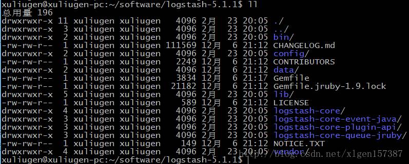 使用tar -xvf logstash-5.1.1.tar.gz 命令解压文件,解压后使用cd命令进入文件夹内部: