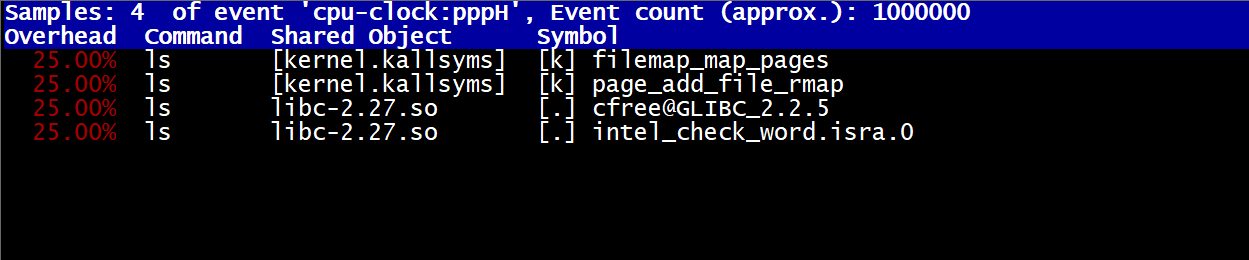 [.]:代表该调用属于用户态,若自己监控的进程为用户态进程,那么这些即主要为用户态的cpu-clock占用的数值,[k]代表属于内核态的调用。