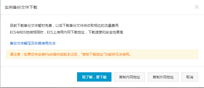 点击“复制内网地址” 或 “复制外网地址” 来获取备份的 内网 或 外网 下载地址。