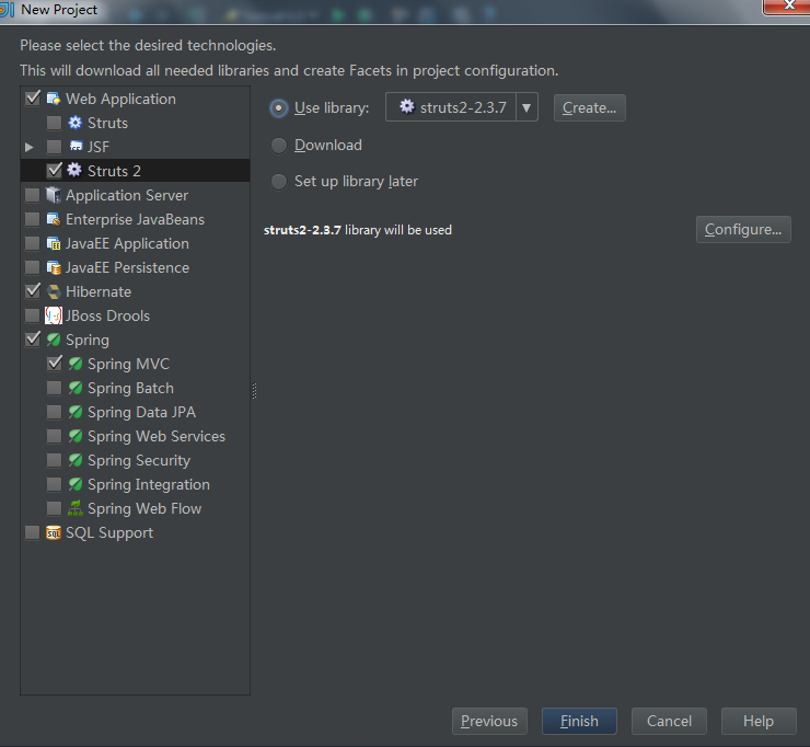选择相应的框架,包括application server tomcat,这里要说明的是,选择的时候它会提示是否下载所依赖的jar