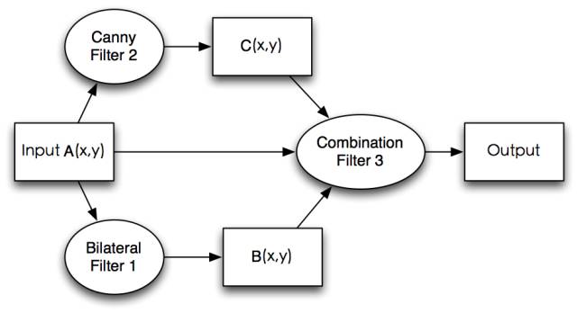 Combination Filter是我们自己定义的三输入的滤波器。三个输入分别是原图像A(x, y),双边滤波后的图像B(x, y),边缘图像C(x, y)。其中A,B,C可以看成是图像矩阵,(x,y)可以看成其中某一像素的坐标。Combination Filter的处理逻辑如下图: