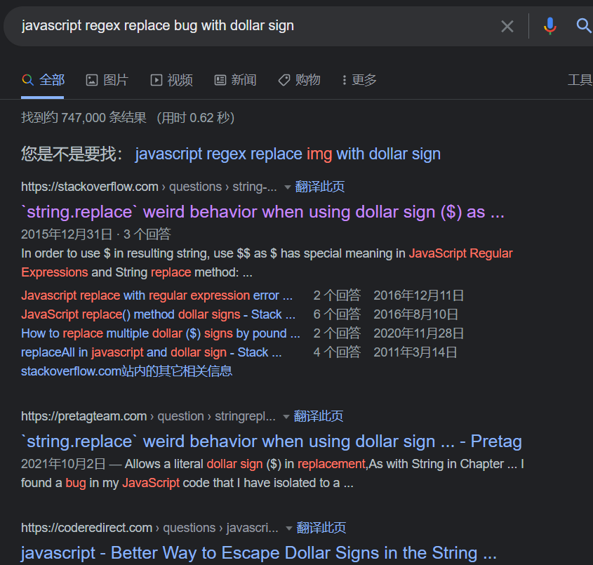 可以说真的非常魔法了,万万没想到JavaScript竟然在待替换字符串这里内置了一些$变量名的用法。要是我没有想着把这篇小记发到个人博客上,说不定还得要好一阵子才能发现这个问题。
