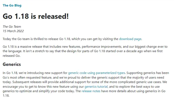 今年3月,万众瞩目的Go 1.18版本发布,Go终于开始支持泛型了!该版本不仅有里程碑式的语法特性变化(支持泛型),还改善了性能、实现了工具链,对运行时和库也做了更改。