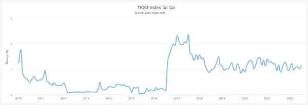 2017年前后Go随着云技术的高速发展而变得特别流行,成为“云基础设施的语言”,并催生了Docker。Go的影响力越来越大,世界各地的Go程序员也越来越多,完全超过了他们最初的预期。在TIOBE编程语言排行中它曾从50名开外蹿升至第10名,现在保持在第12名。