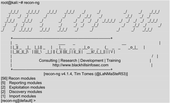 以上输出信息显示了Recon-NG框架的基本信息。例如,在Recon-NG框架下,包括56个侦查模块、5个报告模块、2个渗透攻击模块、2个发现模块和1个导入模块。看到[recon-ng][default]>提示符,表示成功登录Recon-NG框架。现在,就可以在[recon-ng][default] >提示符后面执行各种操作命令了。