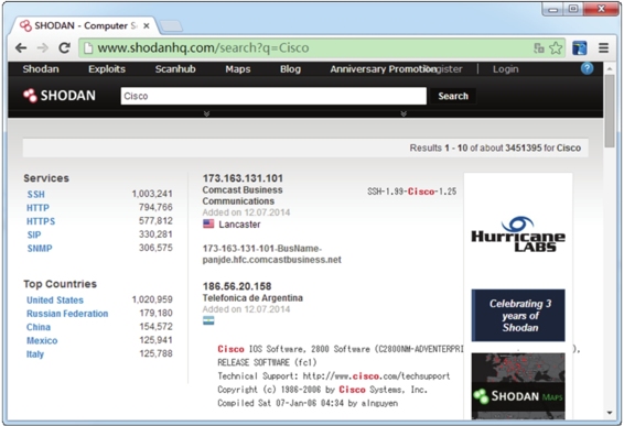 如果要搜索一些东西时,在Shodan对应的文本框中输入搜索的内容。然后,单击Search按钮开始搜索。例如,用户想要搜索思科路由器,则在搜索框中输入Cisco,并单击Search按钮。搜索到结果后,显示界面如图4.6所示。