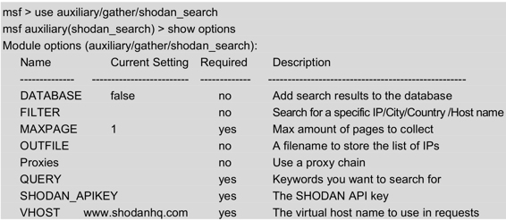 (6)选择auxiliary/gather/shodan_search模块,并查看该模块下可配置的选项参数。执行命令如下所示: