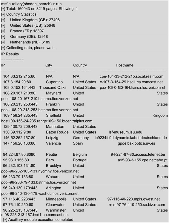 以上输出的信息显示了匹配iomega关键字的所有信息。搜索的结果显示了四列,分别表示IP地址、城市、国家和主机名。如果想要使用过滤关键字或得到更多的响应页,用户必须要购买一个收费的APIkey。