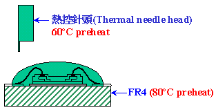 - 有些環氧樹脂需要使用預熱針管,因為環氧樹脂在加熱後會有一段時間降低黏度,有助於環氧樹脂的流動,並降低焊線拉扯的可能性。建議的環氧樹脂預熱溫度為60+/-5°C,PCB的預熱溫度為80°C。