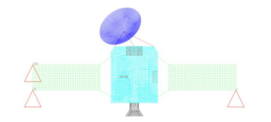 截止到这一步,模型中所有的单元,包括一维,二维和三维单元,都应该已经被正确的赋予了材料和单元类型,并完成了模型连接工作。其中包括实体单元,壳单元和梁单元。壳单元应该被正确的赋予了厚度,梁单元则应该正确的被赋予了截面形状。在下面的工作中,我们将在该模型上添加载荷和约束,以模拟卫星在太空中飞行行为。