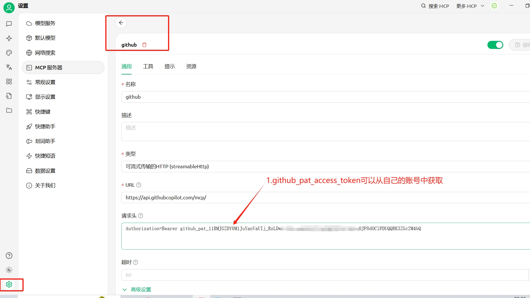 1.在cherry mcp client中进行测试,配置github mcp server,如下所示