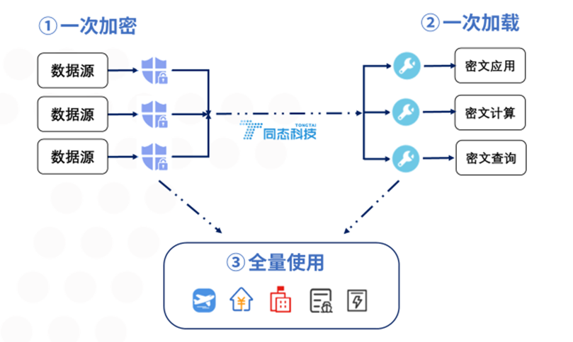 因此,同态科技围绕以同态加密为核心的一系列国产新型密码技术,在充分保护数据隐私安全的基础上,不改变原有业务流程,低成本、低改造地拓展数据应用场景。通过“一次加密,一次加载,全量应用”的新型数据流转模式,实现数据价值最大化,达成 “原始数据不出域,数据可用不可见”目的。