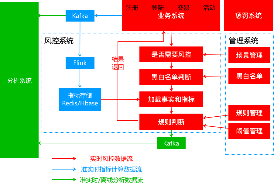 对一个互联网产品来说,典型的风控场景包括:注册风控、登陆风控、交易风控、活动风控等,而风控的最佳效果是防患于未然,所以事前事中和事后三种实现方案中,又以事前预警和事中控制最好。这要求风控系统一定要有实时性。本文就介绍一种实时风控解决方案。风控是业务场景的产物,风控系统直接服务于业务系统,与之相关的还有惩罚系统和分析系统,各系统关系与角色如下: