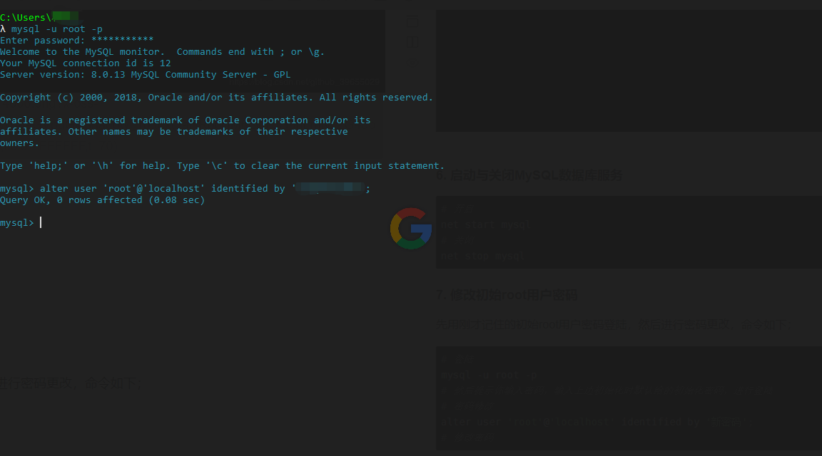 先用刚才记住的初始root用户密码登陆,然后进行密码更改,命令如下;