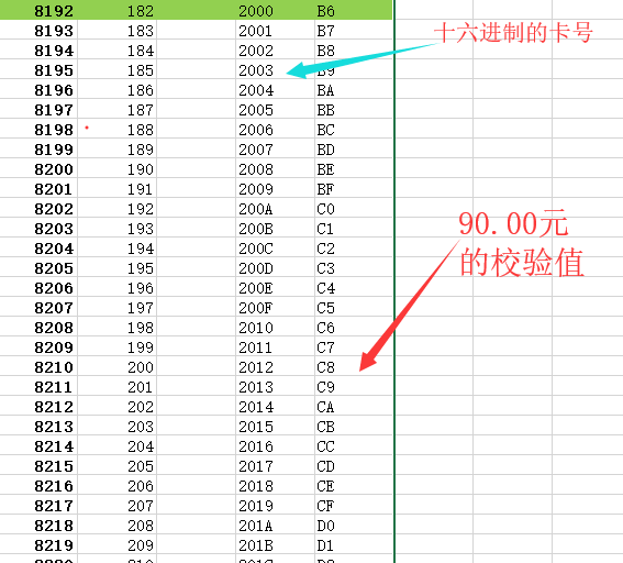 接下来用Excel依据另外五张90.00元的推出这个卡号14BE如果是在2328(90.00元)的情况下的校验值,是68(十六进制)。由此可得到90.00元时的校验值