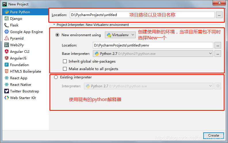 使用Pycharm编写第一个python程序 1.打开 Pycharm,选择 Create New Project,创建一个新项目 2.选择Pure Python表示创建一个纯Python程序项目, ...