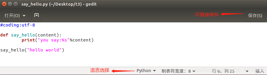 1>ubuntu命令终端输入gedit say_hello.py