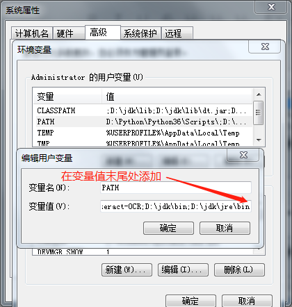 右击计算机属性---高级系统设置---高级---打开环境变量---编辑用户变量栏下的PATH变量