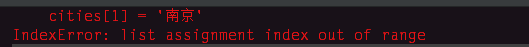 cities[1]='南京' #需指定下标修改,如果指定的下标不存在,会报错