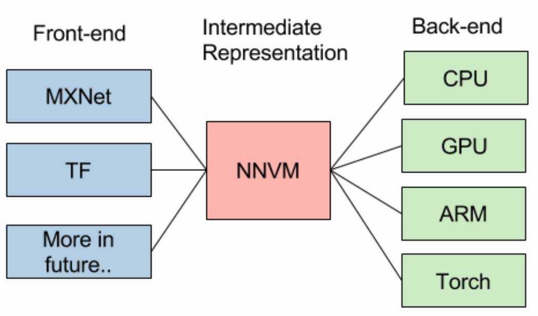对于深度学习,我们需要类似的项目。学习 LLVM 的思想,我们将其取名 NNVM。他的工作原理如下所示: