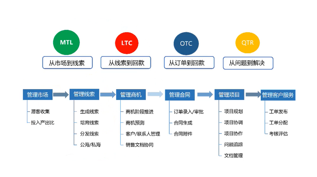 从上面的流程图我们就可以看出,CRM可以管理售前,售中和售后的整个客户生命周期。