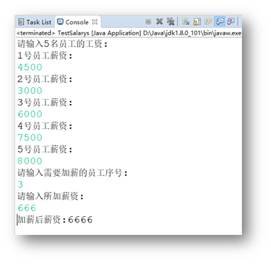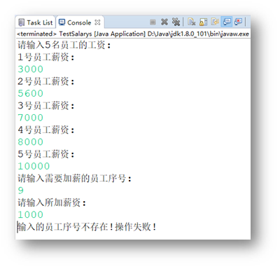 编写Java程序_输入本部门五位员工的薪资,并根据用户输入的序号为指定员工进行提薪。若用户输入序号出现越界,则提示错误。的更多相关文章