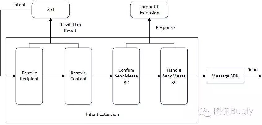 每个 domain 的功能在 Siri 中都有对应的 Intents,而每个 intents 都对应一个特定的 handler 协议。对于发消息来讲,对应的 Intent 和 handler 协议分别为 INSendMessageIntent 和 INSendMessageIntentHandling。只要实现 INSendMessageIntentHandling 协议中的相关方法,并在 Siri 解析出 INSendMessageIntent 请求时用我们的 INSendMessageIntentHandling 对象去处理相关的发消息请求。具体的流程如图5: