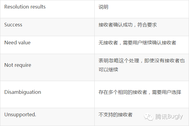 对 Siri 从 Intent 中传递过来的接收者名称进行处理和确认,比如可以确认该名称当前是否在QQ好友列表中,并将 resolution result 反馈给 Siri。Resolution result 代表了应用对 intent 处理后的结果,对于发消息来说,表1列举了几种可能的 resolution results。