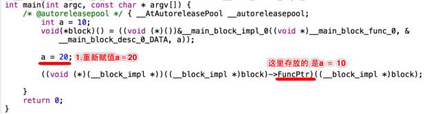 接下来,又重新给 a赋值为 20,但是Block 最终要找到 FuncPtr 里面存放的是值来执行, 在这里才会最终执行打印a 的值的代码,但是这段代码里 a 是 10 了。所以最终打印的还是10。