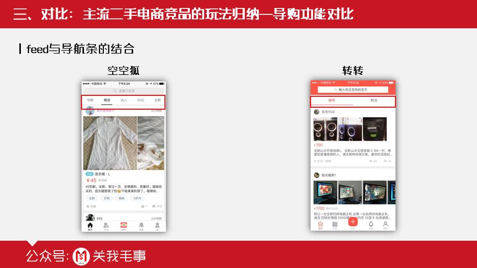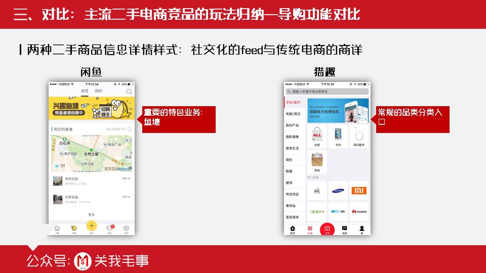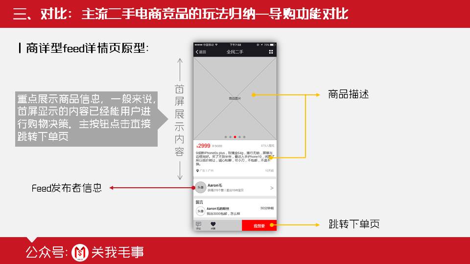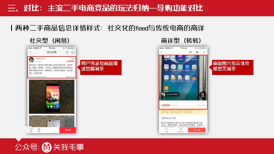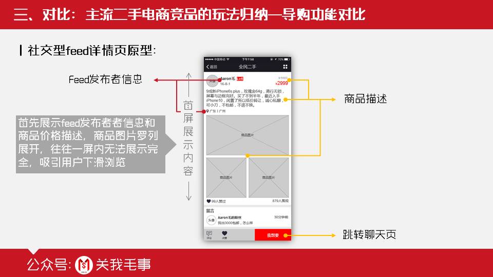 左图是闲鱼的截图,右图是转转。从截图中可以清楚看出来这两个竞品的feed详情页设计思路的不同点: