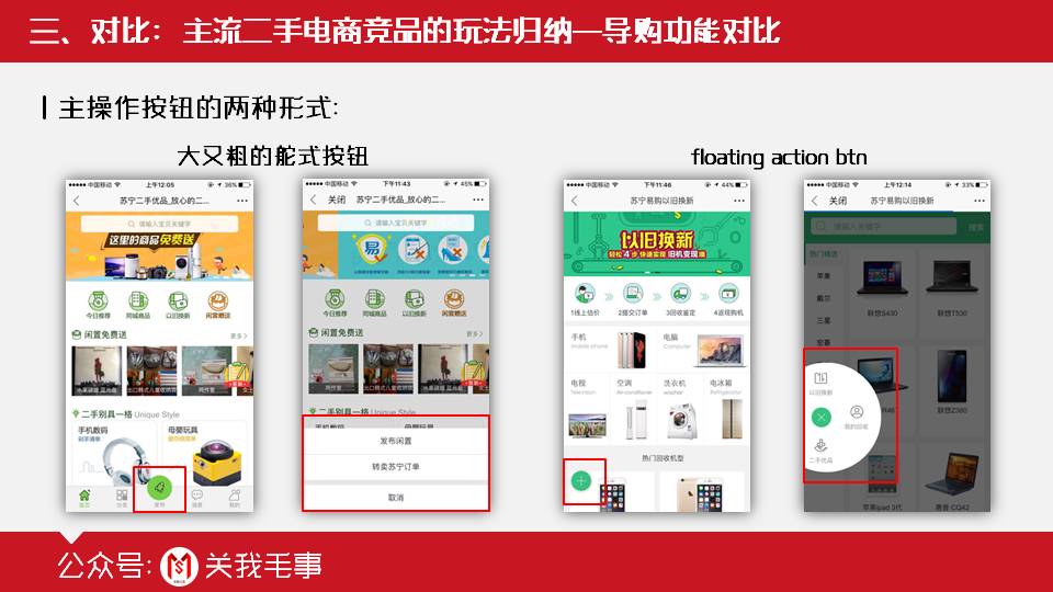 纵观以上四款竞品,无一不例外使用底部固定tab bar导航的方式作为全局导航。更雷同的是其中的闲鱼、转转、苏宁二手、猎趣等绝大部分竞品,均使用“4+1”的tab方案:即“4个常规tab”:默认首页、功能主页、消息聚合页和个人中心聚合页;“1个主操作tab”:发布二手商品信息。
